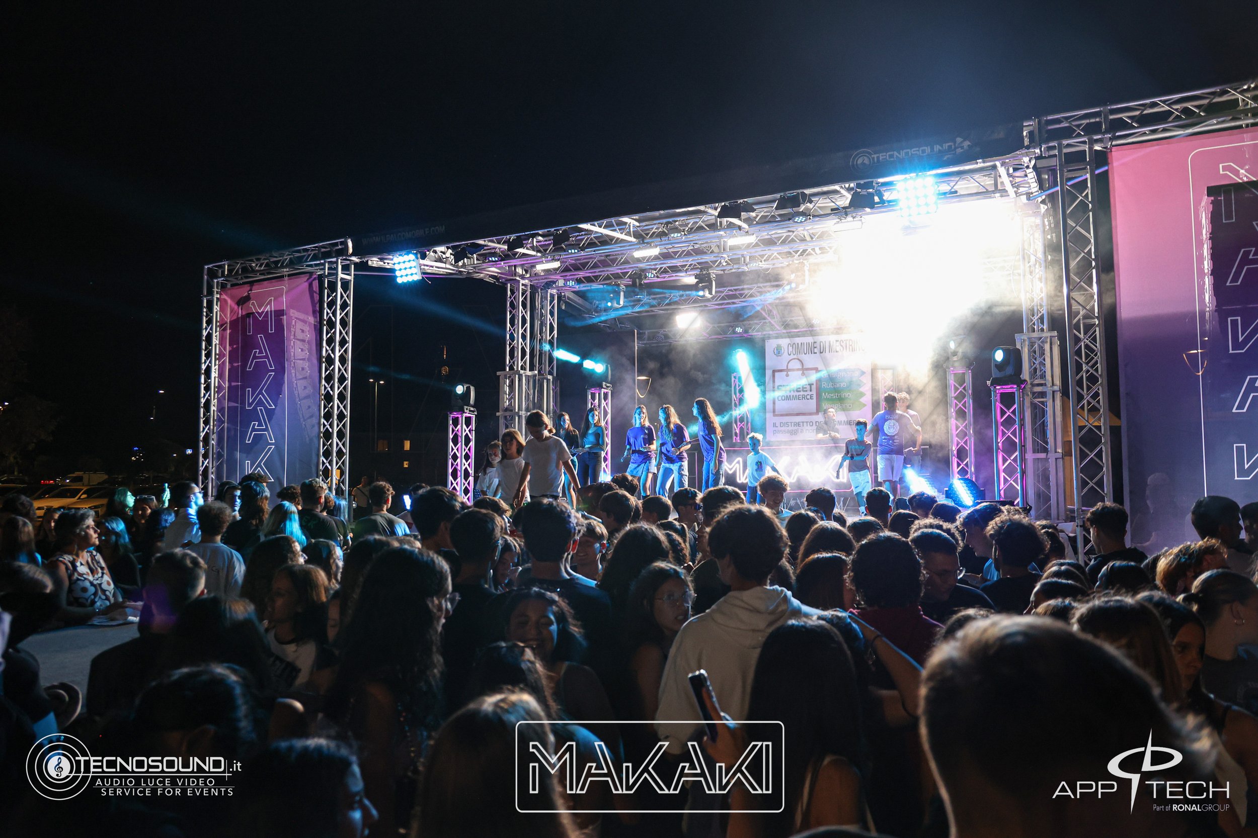 Per gli eventi Makaki a Mestrino (PD), Tecnosound ha fornito un palco mobile professionale completo di luci dinamiche, teste mobili, effetti spettacolari e impianto audio RCF HDL 30 con subwoofer, con consolle Pioneer e animazione interattiva, creando l’atmosfera perfetta per serate disco e intrattenimento musicale.